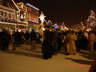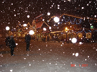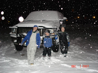 The first weekend in December, we rented a house in Leavenworth, WA and got away for the weekend. They have a big city wide lighting festival every weekend in Dec. They light the trees and then one by one all the buildings turn on their lights. It was a fun evening. The boys had a snowball fight in the street, they got to see Santa and just had a blast. It snowed pretty hard for a little while which was a special treat as it doesn't do that too often around here. Here is us in front of some shops after the crowd disappeared.